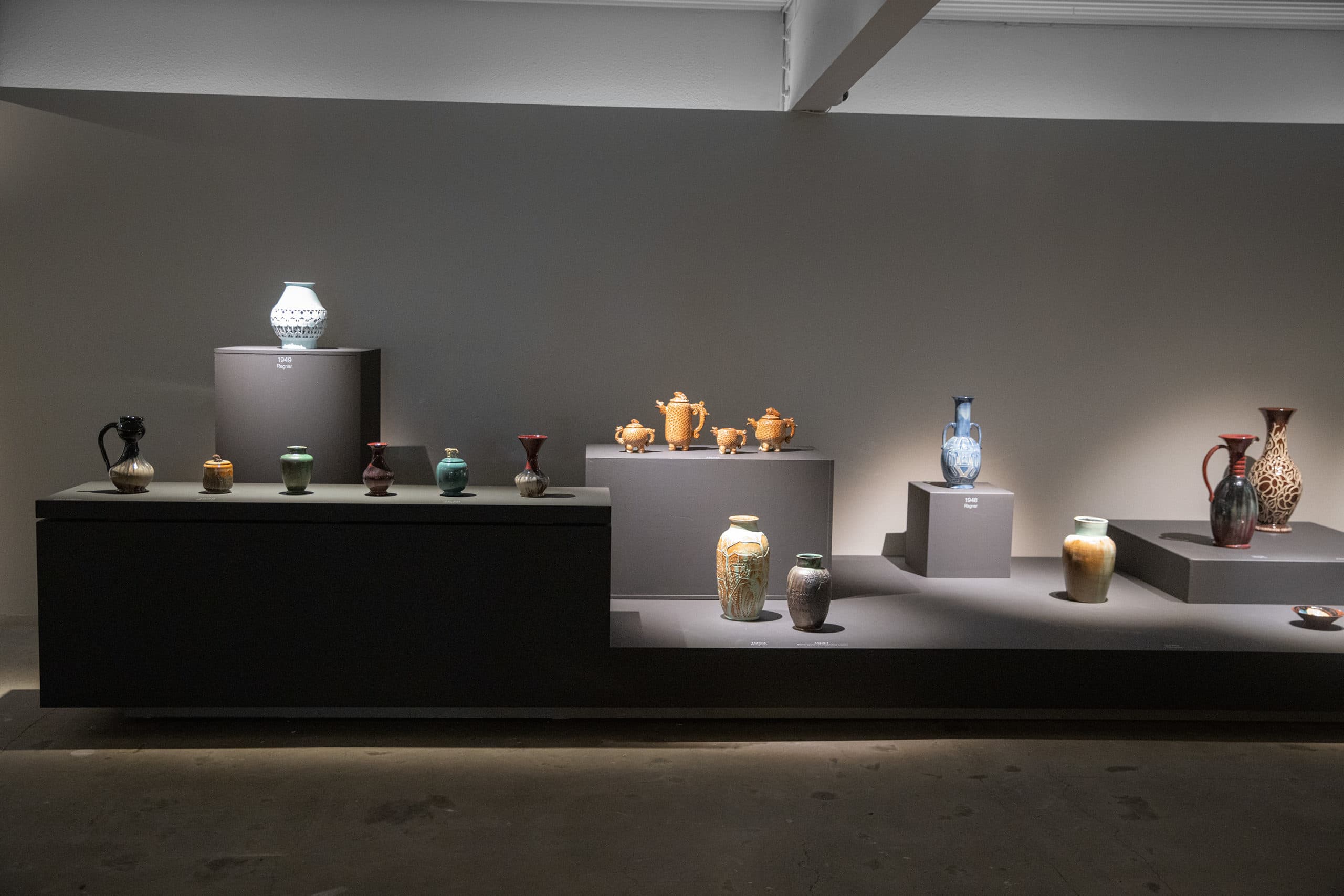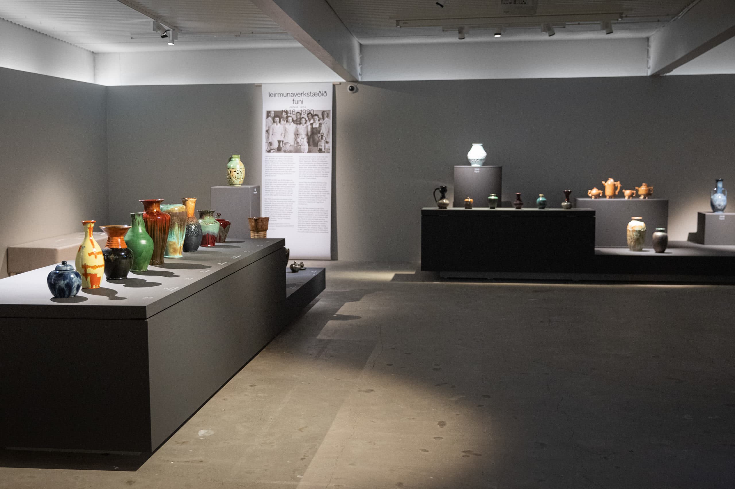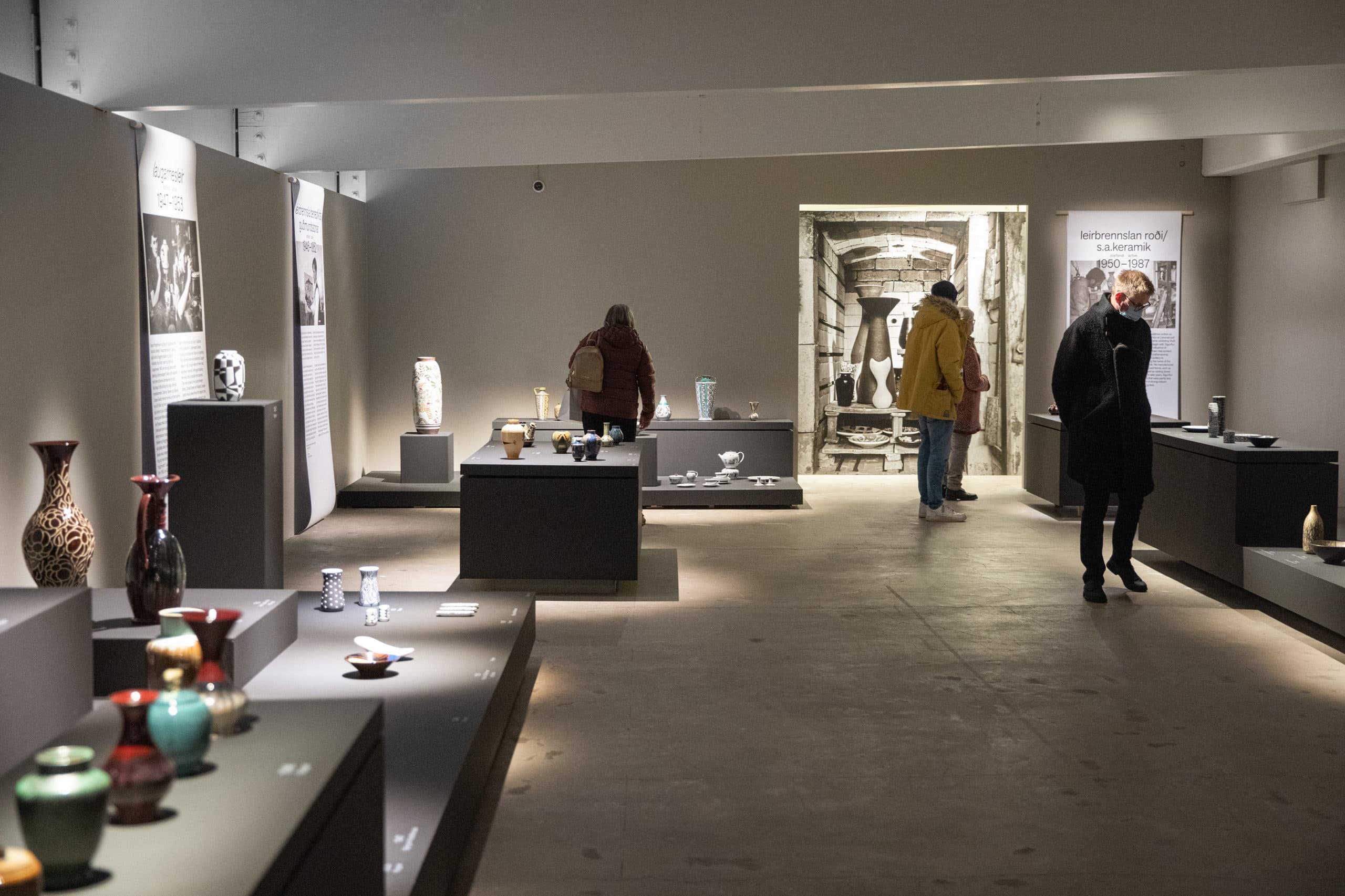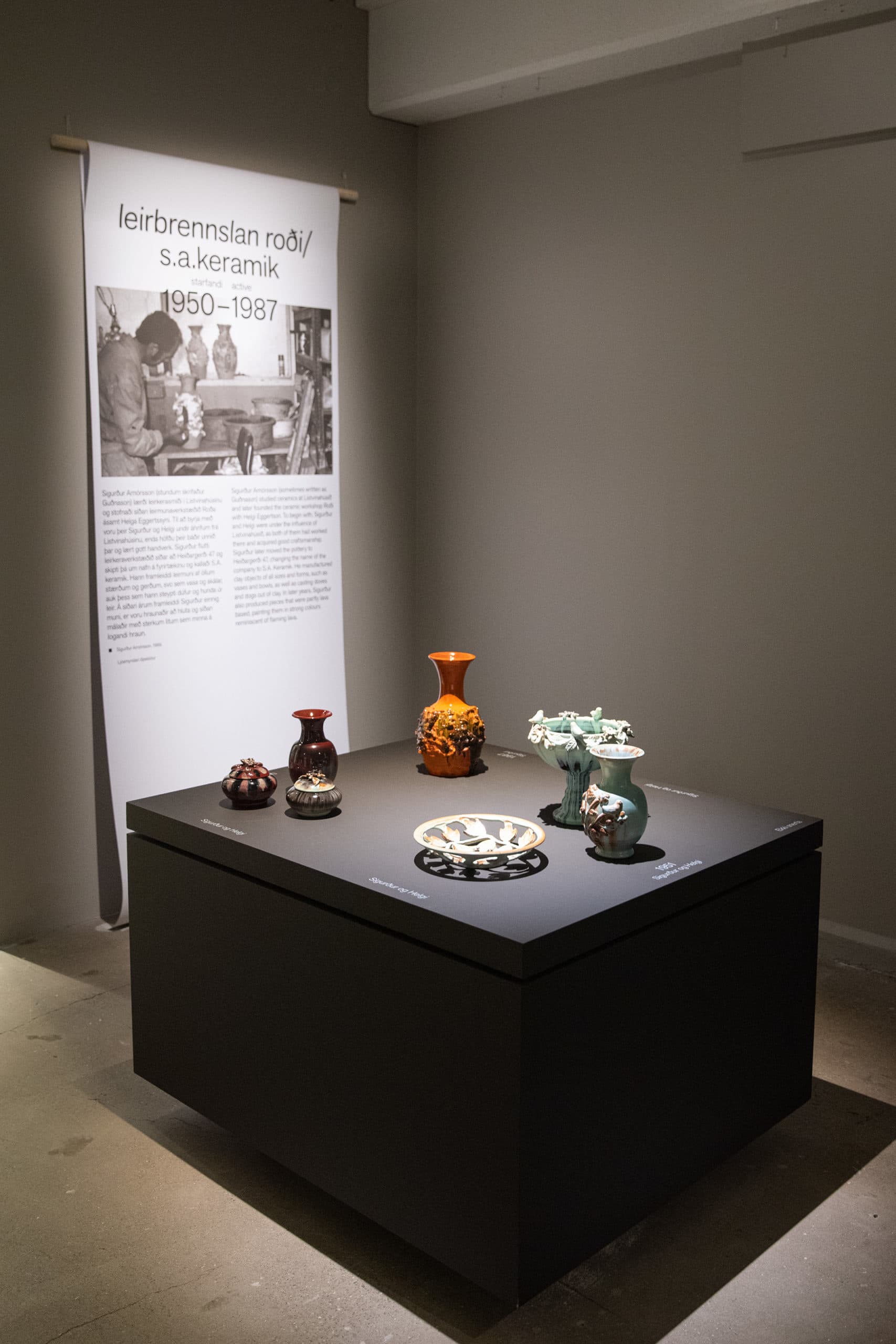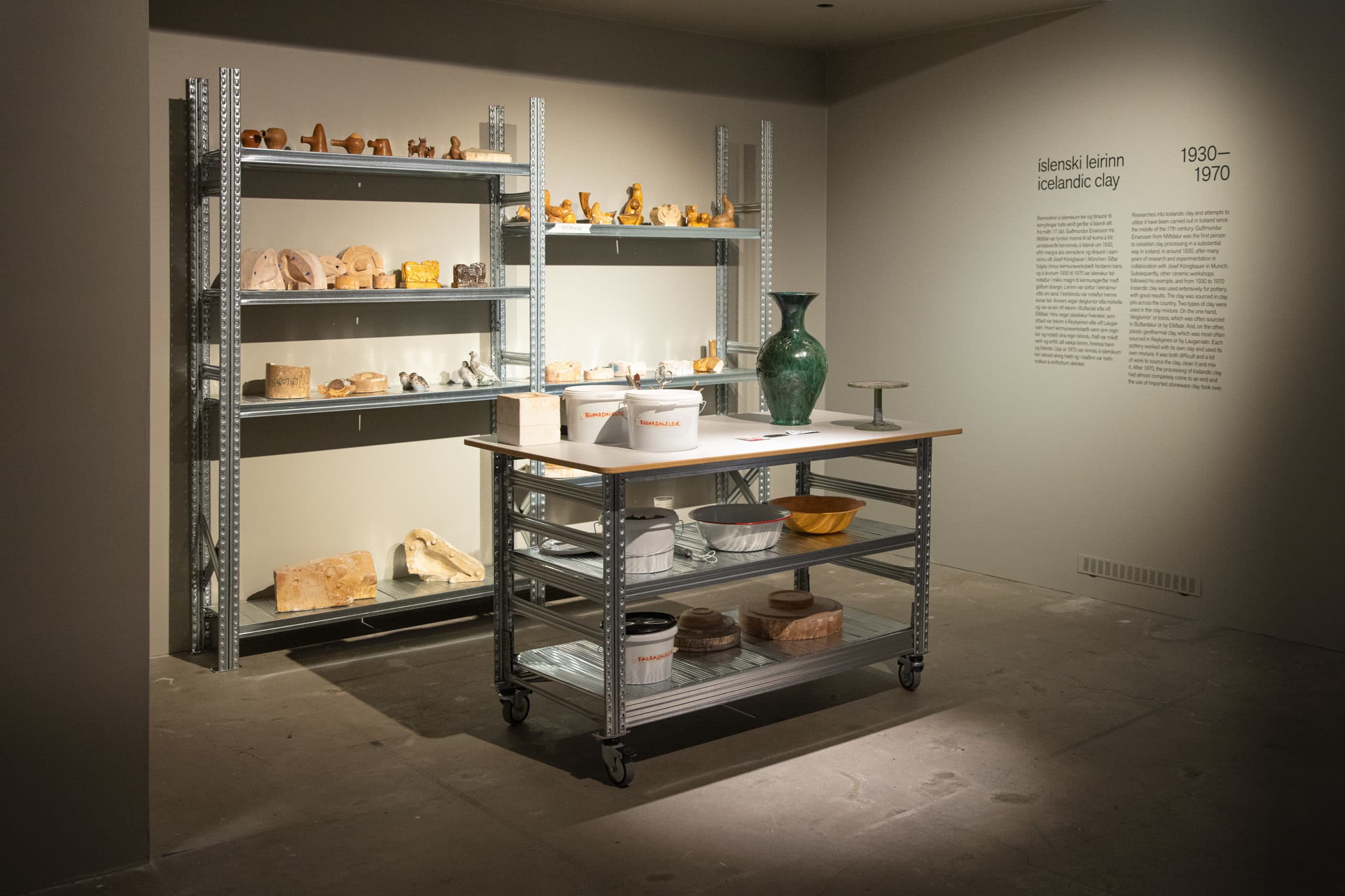 Ceramic art has been with mankind from its earliest times and it is an integral part of the cultural and artistic history of the world. Few relics of ceramic art from ancient Iceland have been preserved. In this context, there exists the word ‘deiglumór’. This ancient word for clay attests to the use of clay to make crucibles in Iceland in early centuries. This history has been forgotten, and yet the use of Icelandic clay was the basis for the fertile ceramic art history of the 20th century. The pioneer Guðmundur Einarsson from Miðdalur founded Listvinahúsið in 1927. From 1946 to 1957 five new ceramic workshops were established in Reykjavik: Leirbrennsla Benedikts Guðmundssonar, Funi, Laugarnesleir, Roði and Glit. Some of these workshops were large, with as many as ten people working on the production process. They all had the use of Icelandic clay in common, up until around 1970. This exhibition includes pieces from the above-mentioned workshops from the time in which Icelandic clay was being used. The aim is to give an insight into the production process of these workshops and to highlight what made each of them unique. In these workshops, both one off pieces and mass-produced ornaments were designed and produced. These included large vases, dinner sets, and souvenirs for tourists. A great deal of artistic ambition was put into unique pieces and the main workshops sought to persuade the public that one off pieces made from clay were on an equal footing with paintings or sculpture. The design and production of Icelandic ceramics marked the start of Icelandic decorative arts in the modern understanding of this term.