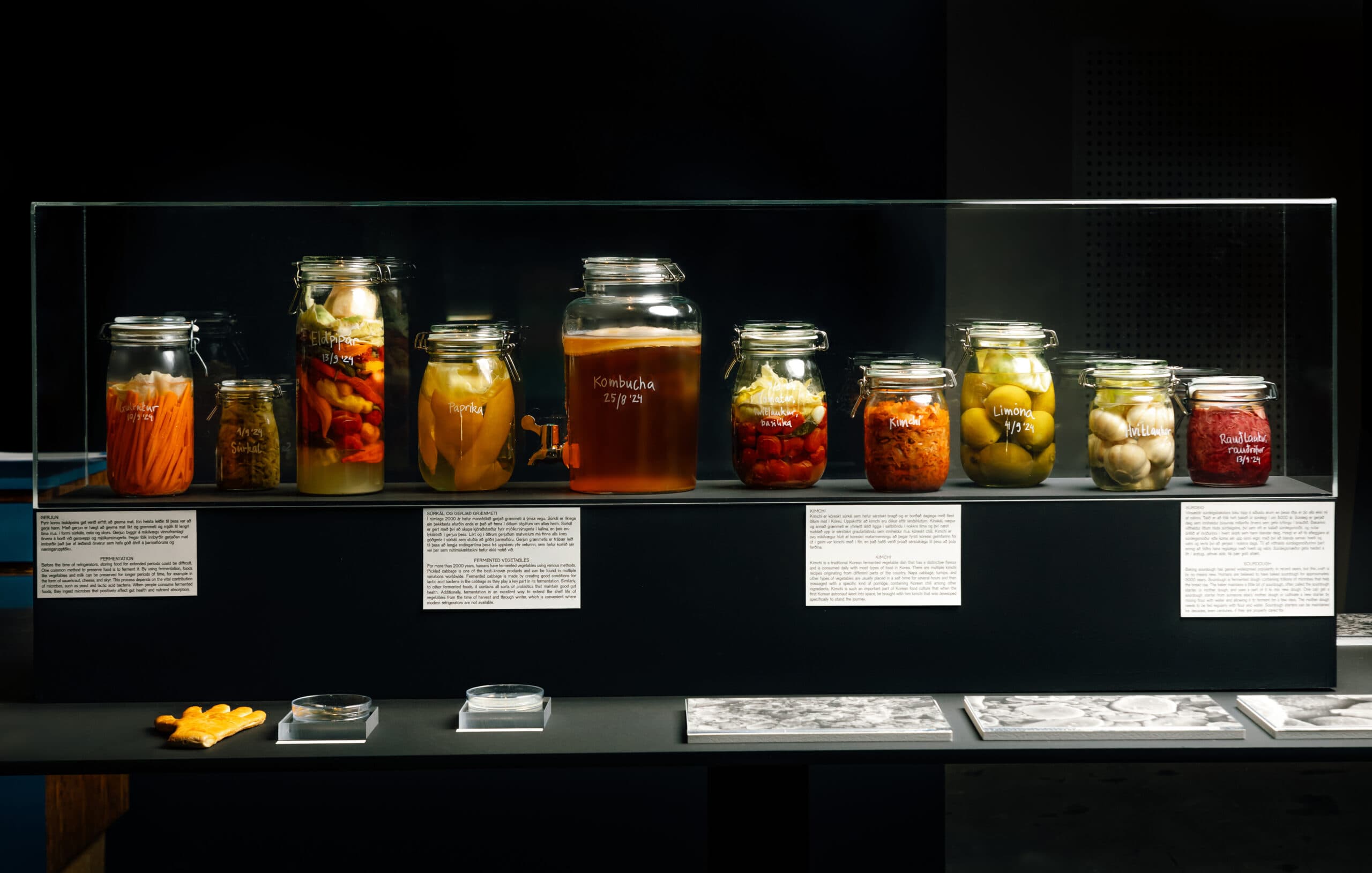 The exhibition Microbes in the Home is part of the Heimsókn exhibition series at the Museum of Design and Applied Art. It focuses on the collaboration between humans and these tiny household members that can be found in almost every corner of the home. The exhibition sheds light on the diverse microbiome that surrounds us and exists within us; to showcase the different ways we collaborate with microbes in everyday life, and to encourage people to extend their conscious cooperation with microbes in their daily lives. The exhibition also highlights designs where collaboration with microbes takes center stage.