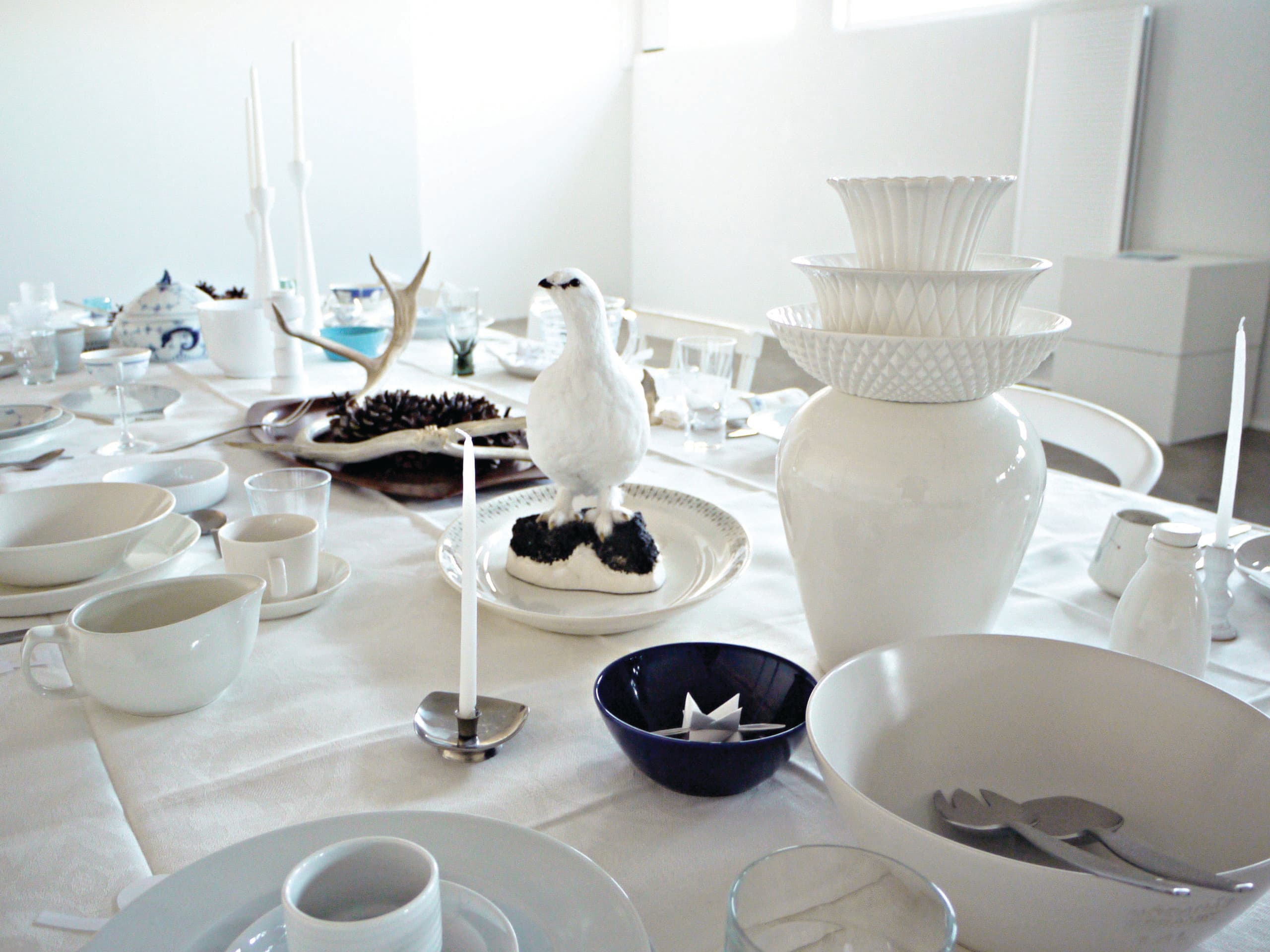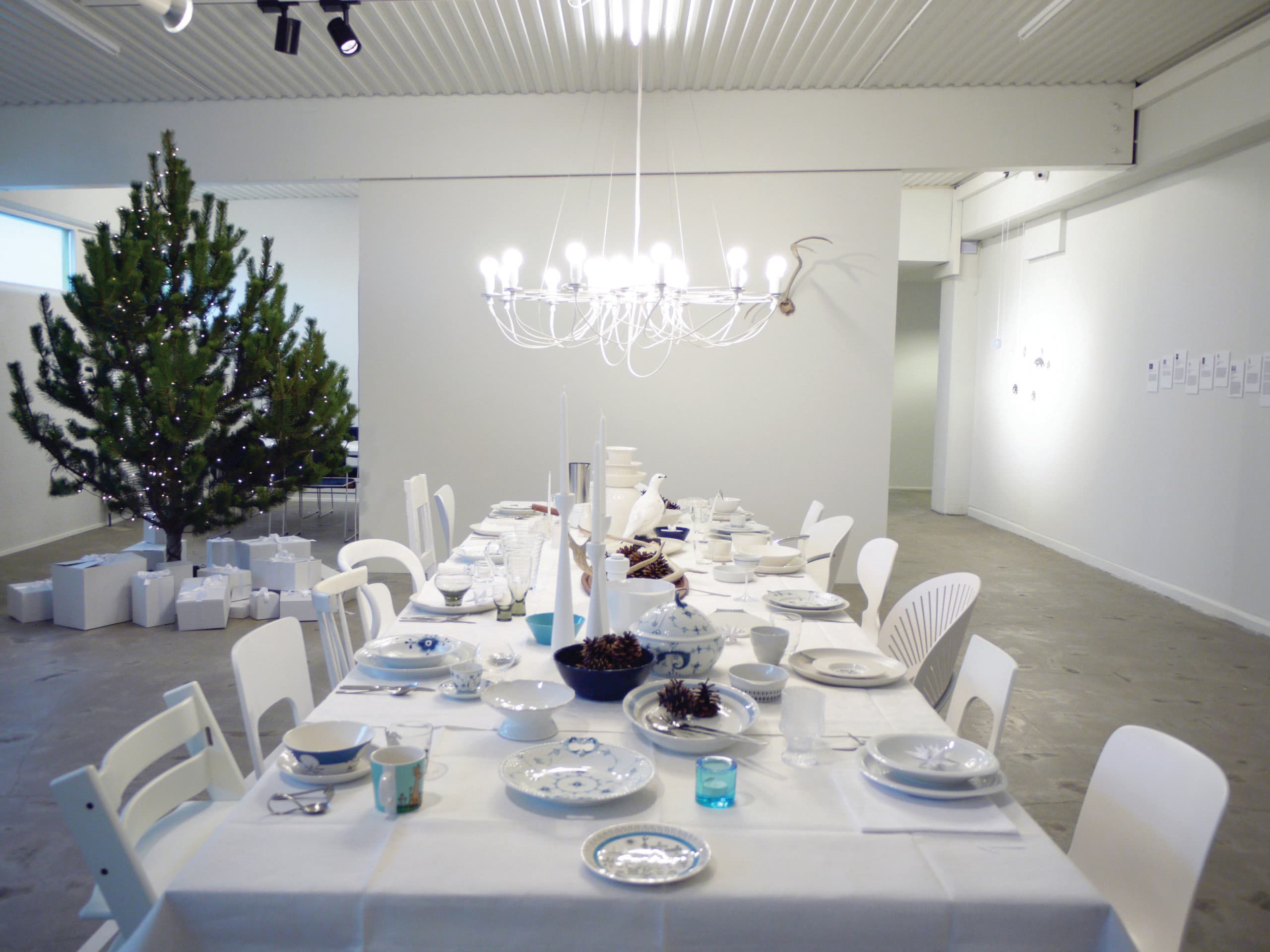 Á sýningunni var ákveðið að útbúa eitt stórt hátíðarborð fyrir þrettán gesti og var lögð áhersla á hvítan borðbúnað. Postulínsstellið Mussemalet frá Royal Copenhagen hefur verið algengt jóla- og sparistell á norrænum heimilum um aldir og því má segja að það stell hafi lagt línuna fyrir sýninguna og blái liturinn því fengið að vera með.